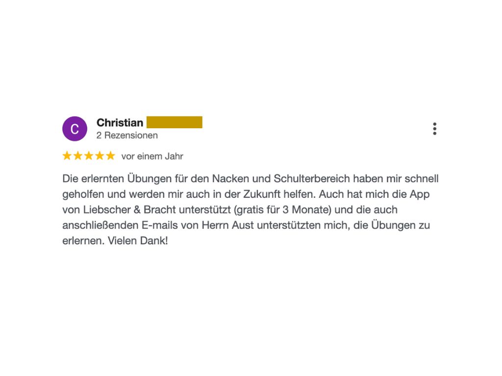 Es geht insbesondere darum, ihnen zu zeigen, was sie selbst tun können um ihren Erfolg dauerhaft zu halten. Der Erfolg der Liebscher & Bracht Schmerztherapie hängt in hohem Maße davon ab, wie regelmäßig die Engpassdehnungen ausgeführt werden.