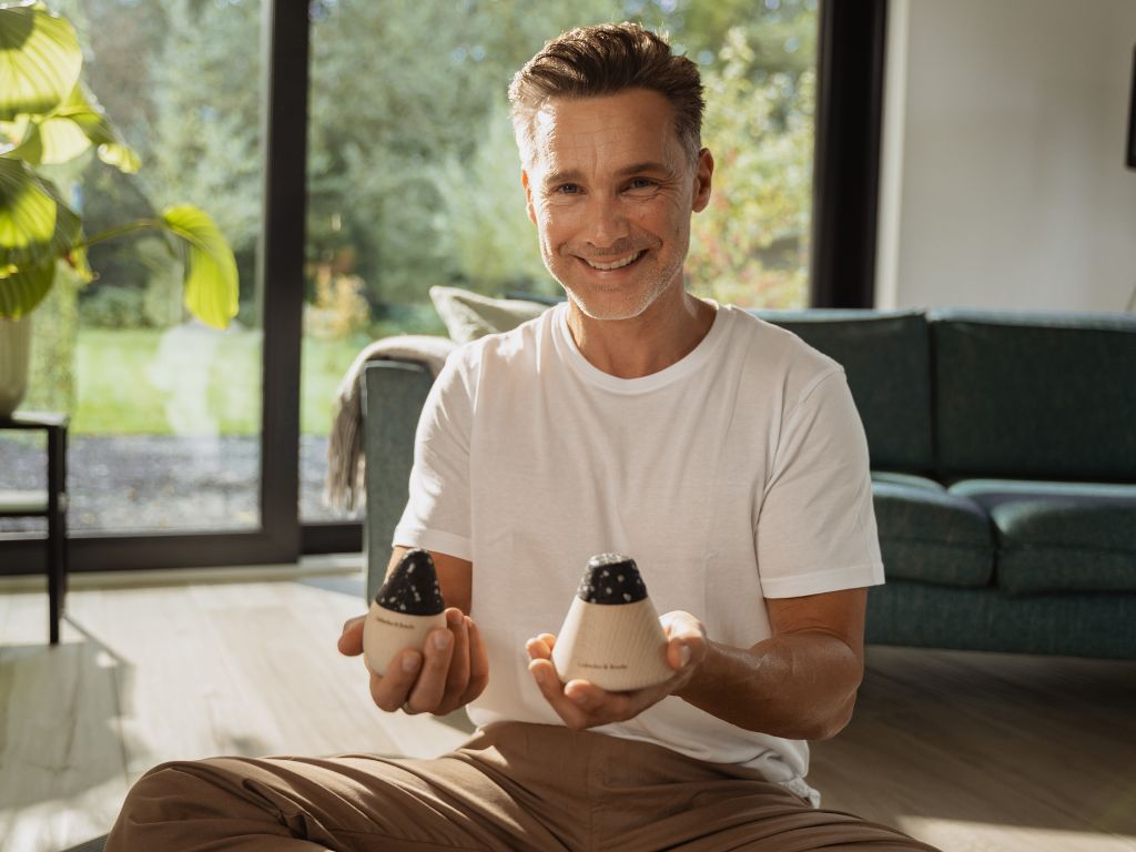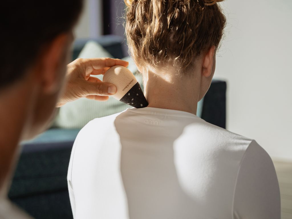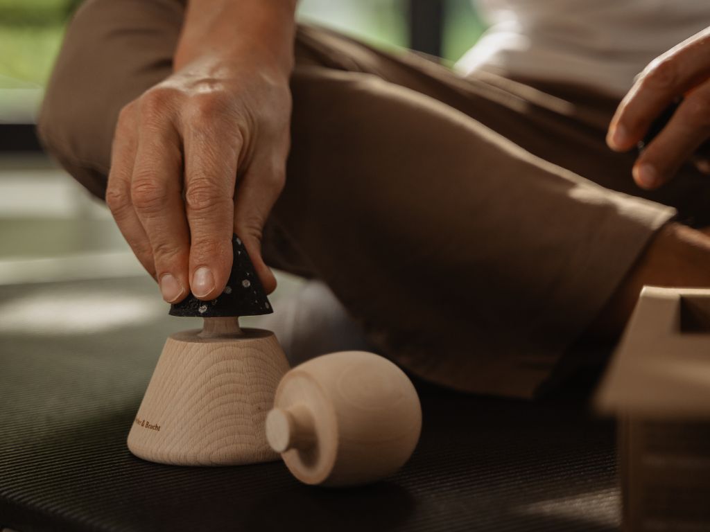 Die Schaumstoff-Aufsätze ermöglichen eine punktuelle und großflächige Akupressur, ohne das Gewebe zu verletzen. Der kugelförmige Griff aus Buchenholz liegt angenehm in der Hand. Der kegelförmige Halter lässt sich bequem am Boden oder an der Wand platzieren